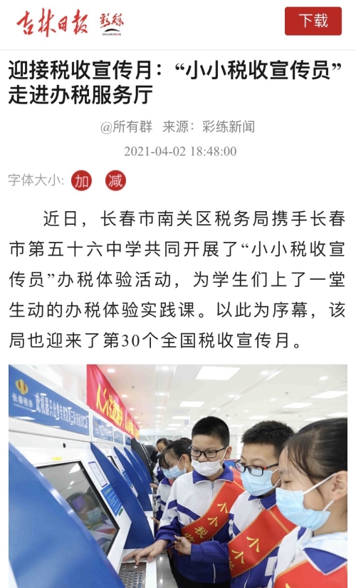 近日,长春市南关区税务局携手长春市第五十六中学共同开展了“小小税收宣传员”办税体验活动,为学生们上了一堂别开生面的办税体验实践课,以此为序幕,该局也迎来了第30个全国税收宣传月的序幕。