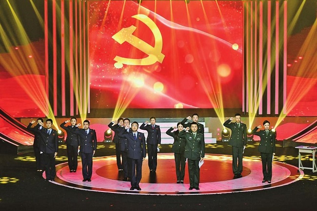 省税务系统退役军人在首届庆“八一”文艺演出中表演情景剧《入党申请书》。