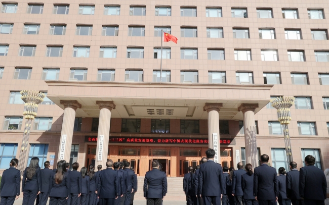 上午9时,伴随着雄壮激昂的《义勇军进行曲》,鲜艳的五星红旗冉冉升起,全体同志整齐列队、精神抖擞,庄严地面向国旗行注目礼,满怀深情高唱国歌,在嘹亮的国歌声中,深切表达对伟大祖国的美好祝愿。