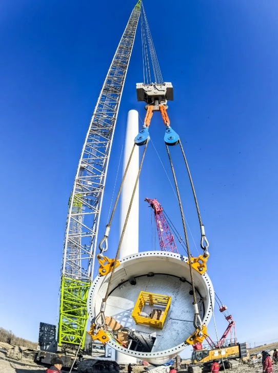 白城市通榆县八面30万千瓦风电项目风机塔吊组装现场。