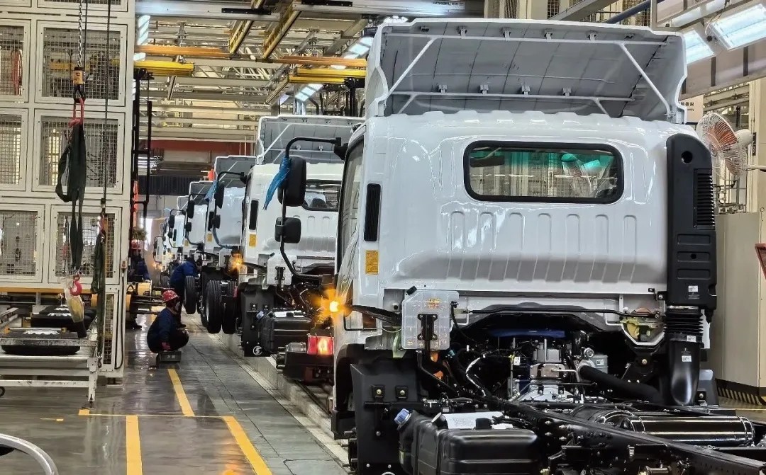 陕汽集团商用车有限公司生产的即将出口中亚的重卡汽车正在整装待发。